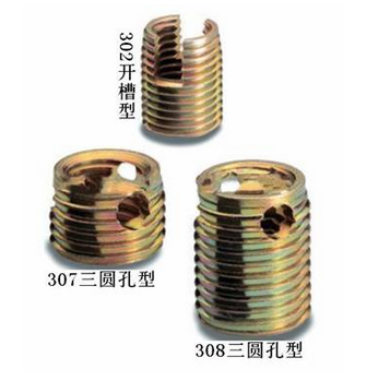 自攻螺套為一種帶開槽或開孔的自攻型螺紋嵌入件,其中開槽型自攻螺套被推薦應用于大多數應用領域。在某些材料上,這種螺套提供完美的特定螺紋鎖功效。如果還不行,一般推薦使用 307/308型,307/308型在材料切割困難方面做出了重大的突破。這種產品不但有很厚的壁,還有三個具有切削能力的圓孔分散于壁上,307/308產品特別適用于材料厚度不太寬裕的情況下。